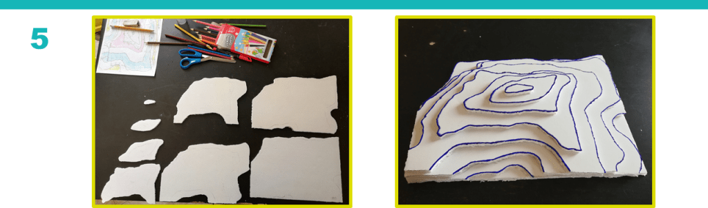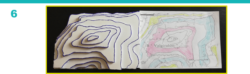 Finito di ritagliare i vari pezzi potrete valorizzarli colorandoli o ripassando i bordi con un pennarello colorato. Io ho preferito questa seconda opzione ed ho tracciato a matita la curva di livello immediatamente più interna per avere una guida nell’impilamento dei vari livelli.